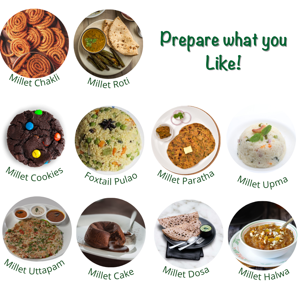 Milletamma’s foxtail flour is prepared by high quality foxtail millet, which provides high calories. It is rich in antioxidant so slow down aging process. The presence vitamin B1 provides proper function of cardiac muscle. It enhances memory power. Specification:Vegan, Gluten free, Organic.