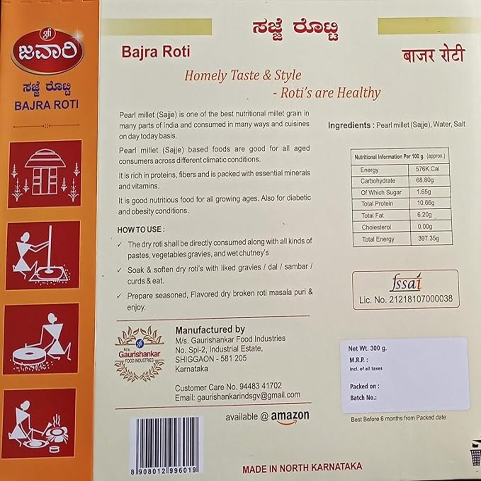 Discover the unique taste and health benefits of Jawari BAJARA ROTTI. Made with 100% quality ingredients and packed with essential nutrients, this 300Gm pack is perfect for a healthy and delicious meal. Experience the perfect blend of taste and nutrition with Jawari BAJARA ROTTI.