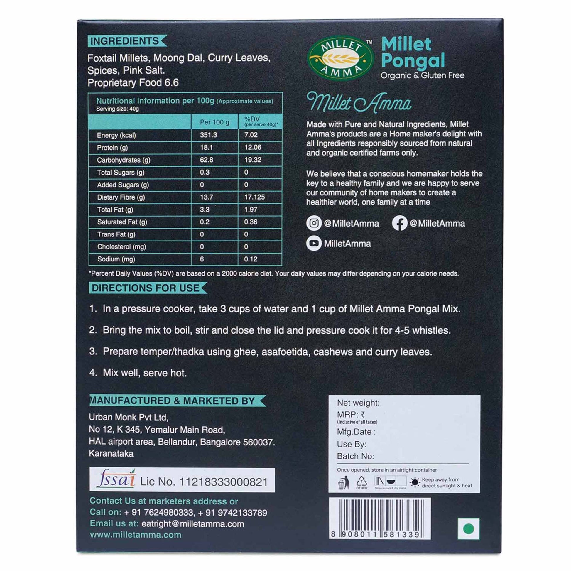 Milletamma Pongal mix is packed with higher calcium content that helps in proper nerve functioning. The millets present in the Pongal mix have micronutrients that help in maintaining the blood sugar level. Millet Pongal Mix is made from organically grown millets. Specification: Vegan, Gluten Free Organic.