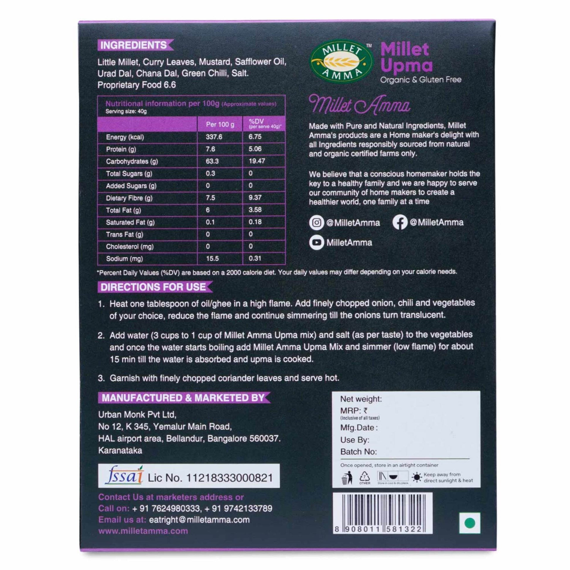 Milletamma Millet Rava Upma mix is rich in proteins that help in weight loss. It is good source of calcium that helps you in strengthening the bones It contains antioxidants and amino acids like Tryptophan that acts like a natural Relaxant. It is: Vegan, Gluten Free, Organic.